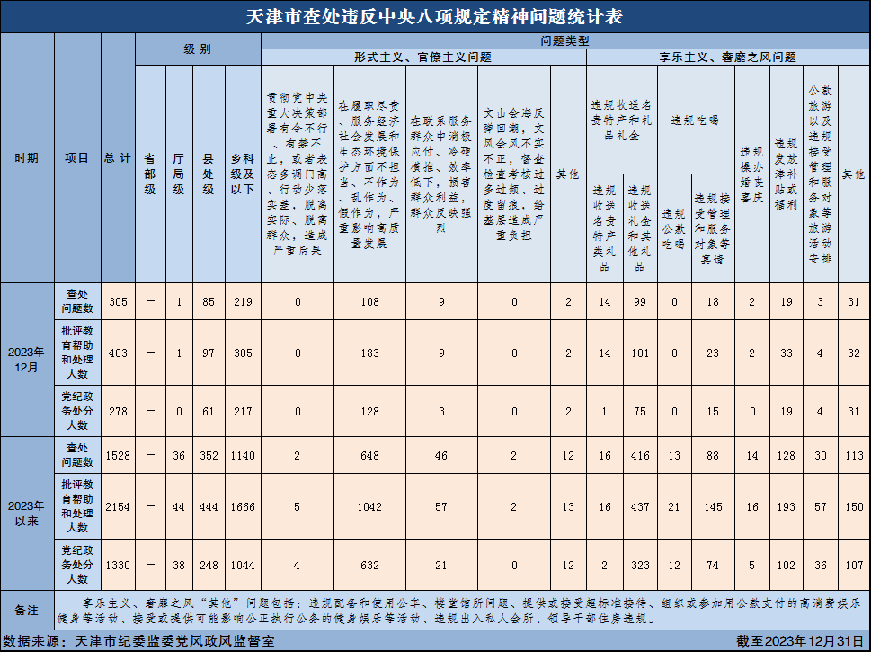 2023年以来,截至12月31日,天津市查处违反中央八项规定精神问题情况如下: