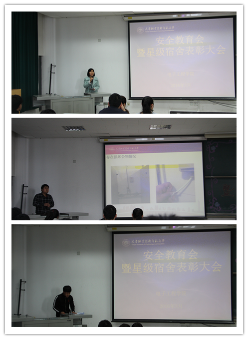 会上,院学工办主任陈云涛老师对2015年学生宿舍的整体情况进行总结,并通过PPT以图片的形式向同学们展示了目前学院男、女生宿舍存在的有关问题,如宿舍吸烟、卫生安全等,有些宿舍仍存在破坏公物、堆放垃圾、使用违禁电器、悬挂衣物过多等现象,他要求同学们进一步强化安全责任意识,维护好宿舍环境。