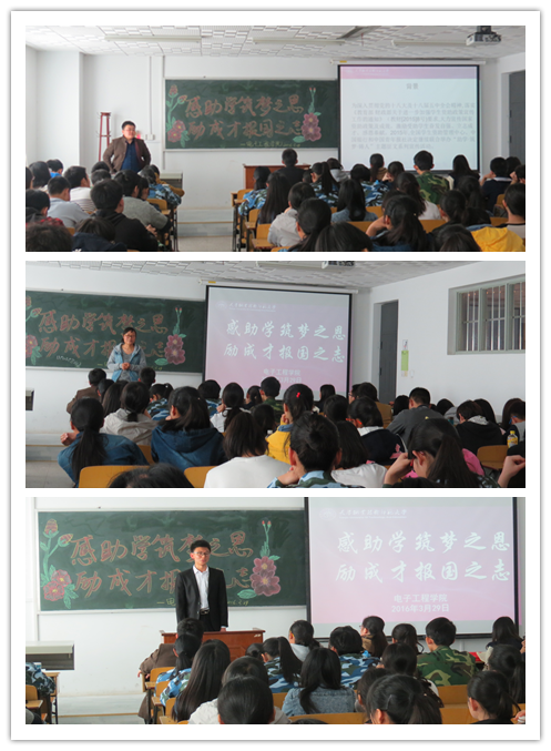 此次主题宣讲活动是电子学院 “助学、筑梦、铸人”系列宣传活动之一,旨在通过榜样典型的示范作用,激励在校受助学生学会感恩,自强不息,立志成才。