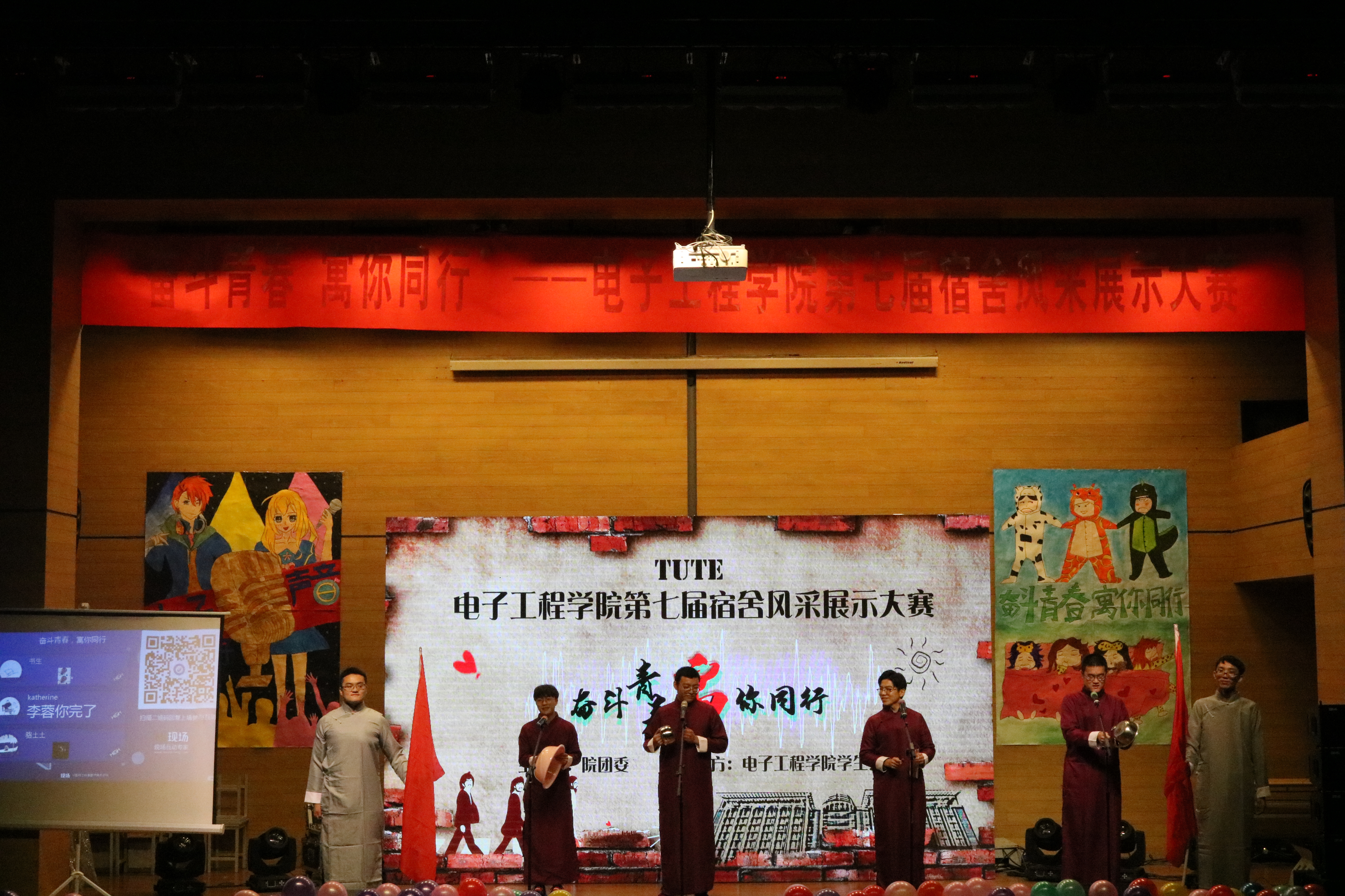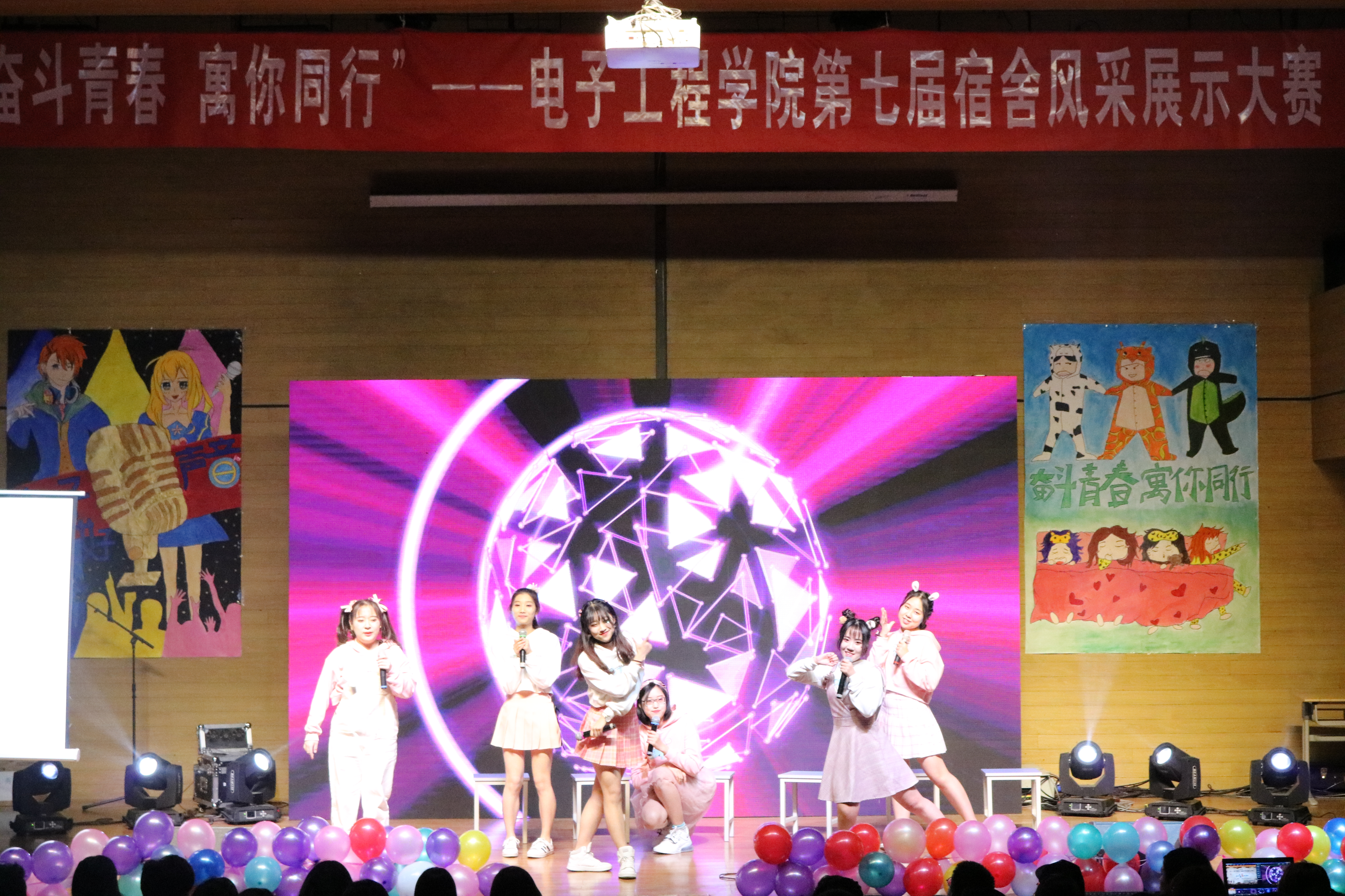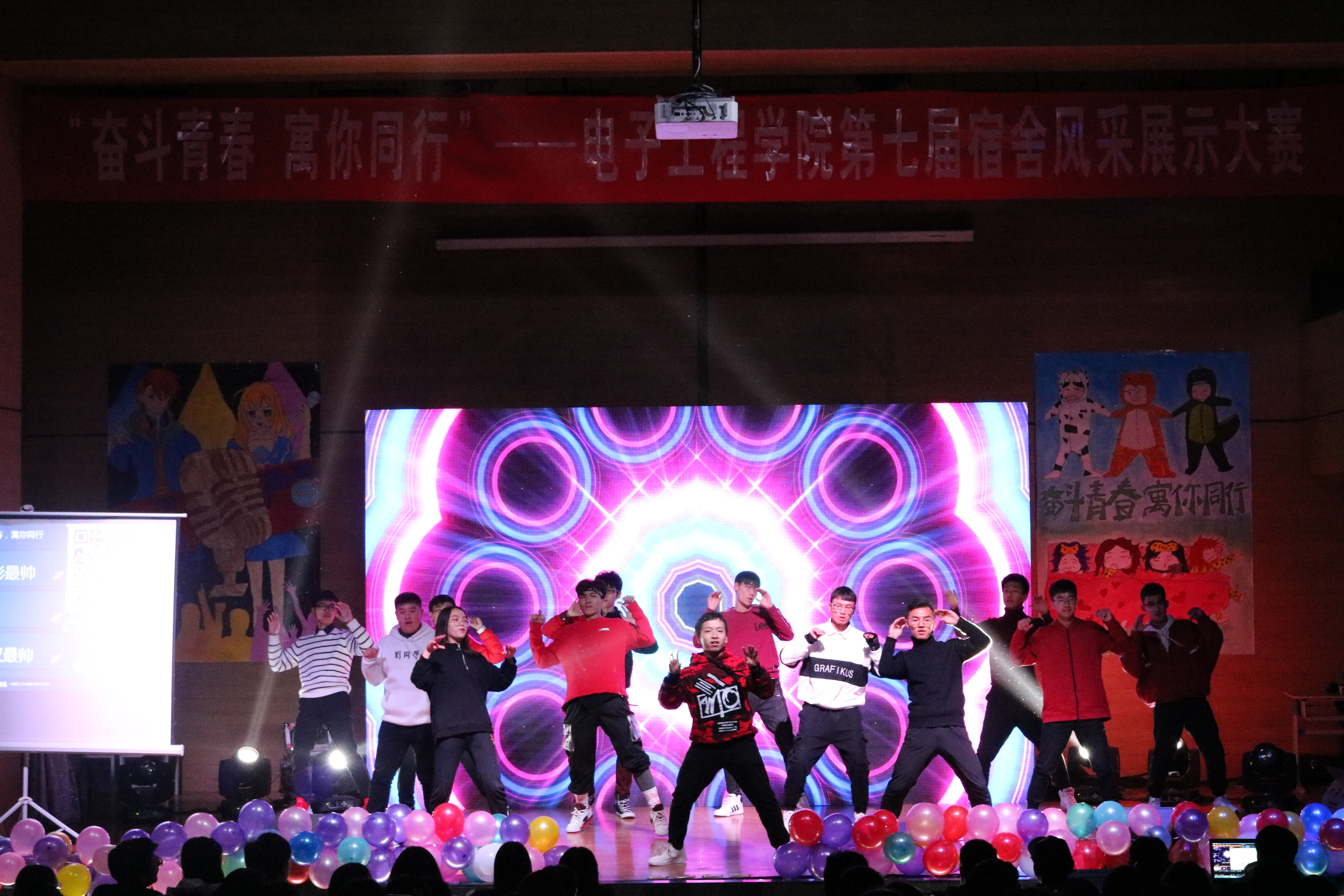 在决赛现场,2018级班长们用热情活泼的舞蹈串烧《MOMOLAND+GO,GO+葫芦娃》拉开当晚比赛的序幕。接下来进入决赛的8支宿舍代表团通过个性化视频介绍依次亮相登场,创意无限。在展示环节中,1号学生公寓301宿舍的歌曲串烧《6A级风景区》、13号学生公寓218宿舍的《超强音浪》通过热情的歌声和炫酷的吉他弹唱彰显出新生的蓬勃朝气;1号学生公寓220宿舍的歌舞表演《Dancy Party》、13号学生公寓111宿舍的《宇宙泰山》活泼灵动,再现宿舍同学间亲密友好的关系;1号学生公寓219宿舍带来唱跳表演《爱你》,用甜美的歌声和优美的舞姿诠释青春的热情;13号学生公寓814宿舍的原创三句半作品《咱们不一样》,形式新颖,语言风趣,刻画出学生眼中独特的电子风采;13号学生公寓204,217,813宿舍联袂带来主题表演《致青春-年少之路》展示出少年们拥抱青春,勇于奋斗的精神面貌;13号学生公寓513宿舍压轴带来经典童年歌曲《月亮船》,将我们带回了童年时代,回忆满满。