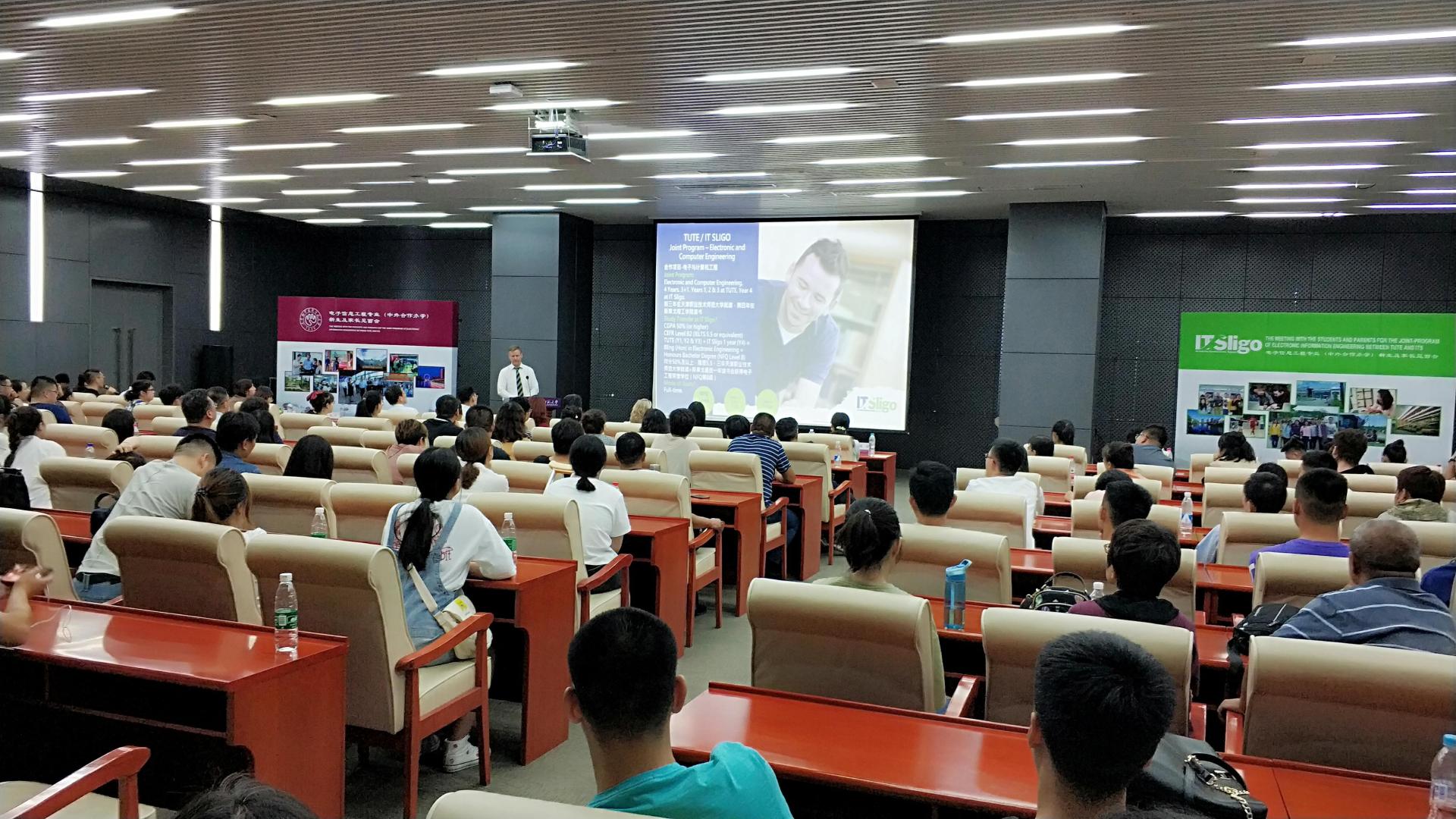 电信中外合作办学家长见面会上,新生和家长们一同观看了学校、学院宣传片。副校长阎兵以及爱尔兰驻华使馆教育参赞Lavina Collins致辞,对中外合作办学给予肯定并对2019级新生提出鼓励和希望,斯莱戈理工学院教师Fabian Connolly和学院教师李莉分别介绍了ITS和合作办学基本情况及相关教师, 2018级中外合作办学班学生代表和2019暑假ITS游学夏令营代表进行分享发言。