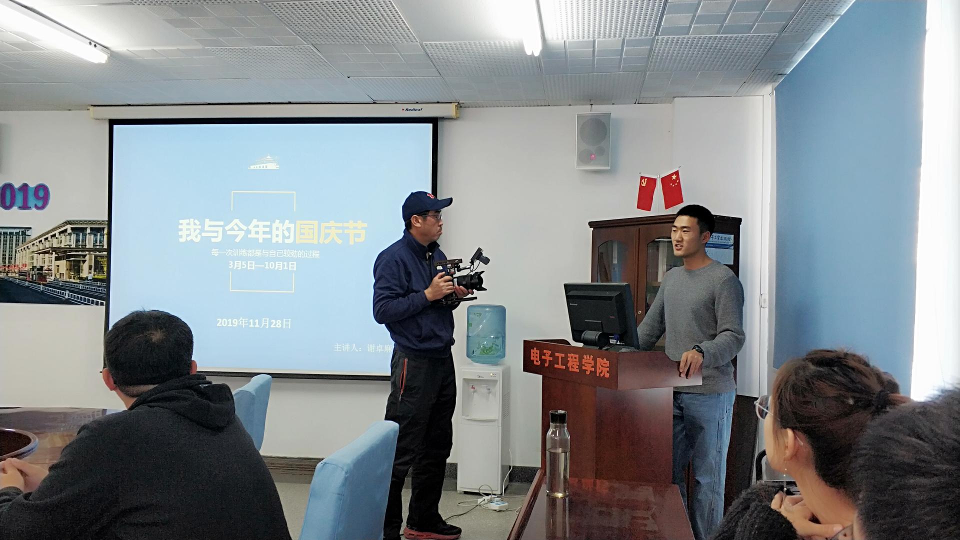谢卓麻加,藏族,原微电1402班学生,2017年9月参军入伍,加入陆军第81集团,2019年10月1日,参加国庆70周年大阅兵。分享会伊始,一段令人热血沸腾的训练视频记录了维和部队备战阅兵的艰辛历程,在场师生深受感染。紧接着,谢卓麻加讲述了自己与今年国庆阅兵之间的故事。从今年2月份进行初期选拔时认为自己和大阅兵遥不相及,到努力克服自身缺陷、咬牙坚持,挺过中期淘汰,克服烈日和伤痛的折磨,最终光荣地接受检阅,不负军人使命。谢卓麻加用自己的经历向其他藏族同学表明,大家要相信自己的能量是超乎想象的,要敢于付出努力和拼搏,在挑战自我中激发无限潜能,不断成为更好的自己,为国争光!现场师生纷纷感慨于阅兵战士们的坚强意志与强大信念,精神深受鼓舞,自发响起阵阵掌声。