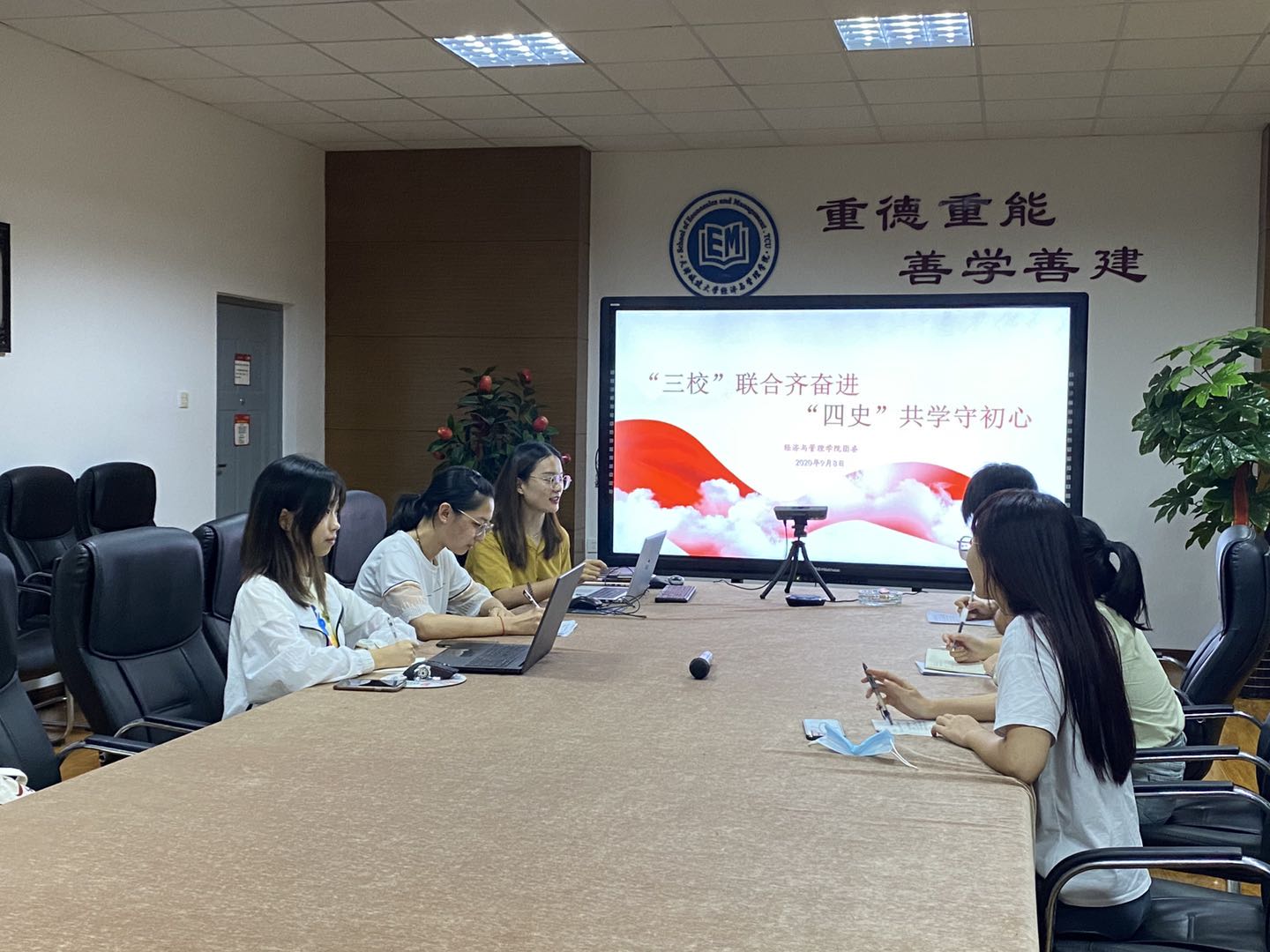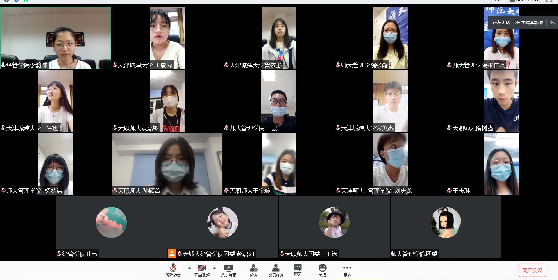、天津城建大学经济与管理学院、天津师范大学管理学院,三所高校组织了团支部云共建学习交流会。活动通过参观“伟大历程 辉煌成就 ——庆祝中华人民共和国成立70周年大型成就展” 网上展馆,使学生了解革命先烈的英勇事迹,激发爱国情怀,增强忧患意识。以“四史”学习教育为契机,结合中国人民抗日战争曁世界反法西斯战争胜利75周年, 以“三校联合齐奋进·‘四史’共学守初心”为主题,三校分团委负责老师、优秀团干部代表、共青团员参加了此次云共建交流会。