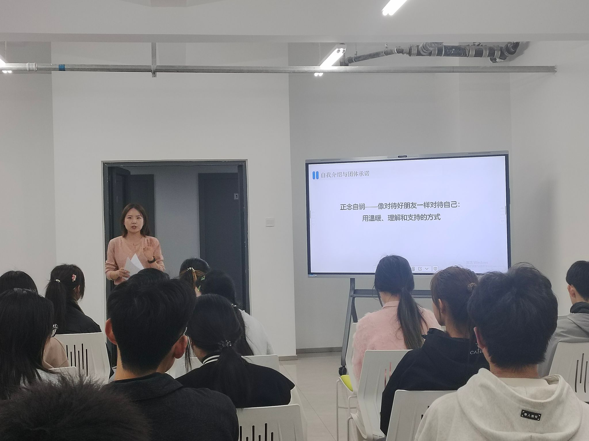4月2日,“全然回归当下”活动中以意向指引热身操开启身心疗愈。学生们将烦恼“放入”气球中,通过“吹气球—踩爆烦恼”的仪式感动作,直观体验将情绪外化为可处理对象。正念伸展与三分钟呼吸空间练习中,采用呼吸锚进行正念讲解,引导大家关注当下情绪,放松身心,建立与身体的联结。活动结束后,有学生分享 “感受到血液流动的酥麻感”,觉察到身体与情绪的深层联结。