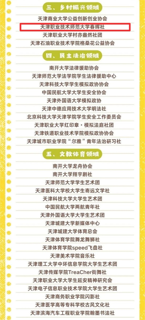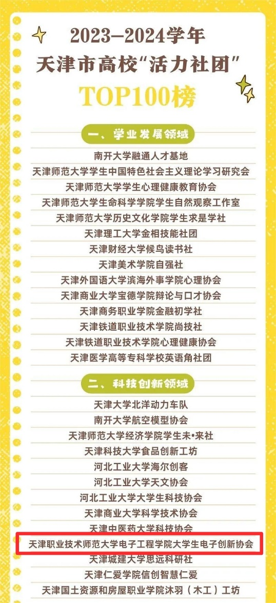 大学生电子创新协会(科技创新领域),春晖社(乡村振兴领域)、国旗护卫队(卫国戍边领域)、中外交流协会(对外交流领域)、职业教育学院青春健康同伴社(对外交流领域)5个社团入选2023-2024学年天津市高校“活力社团”TOP100榜。