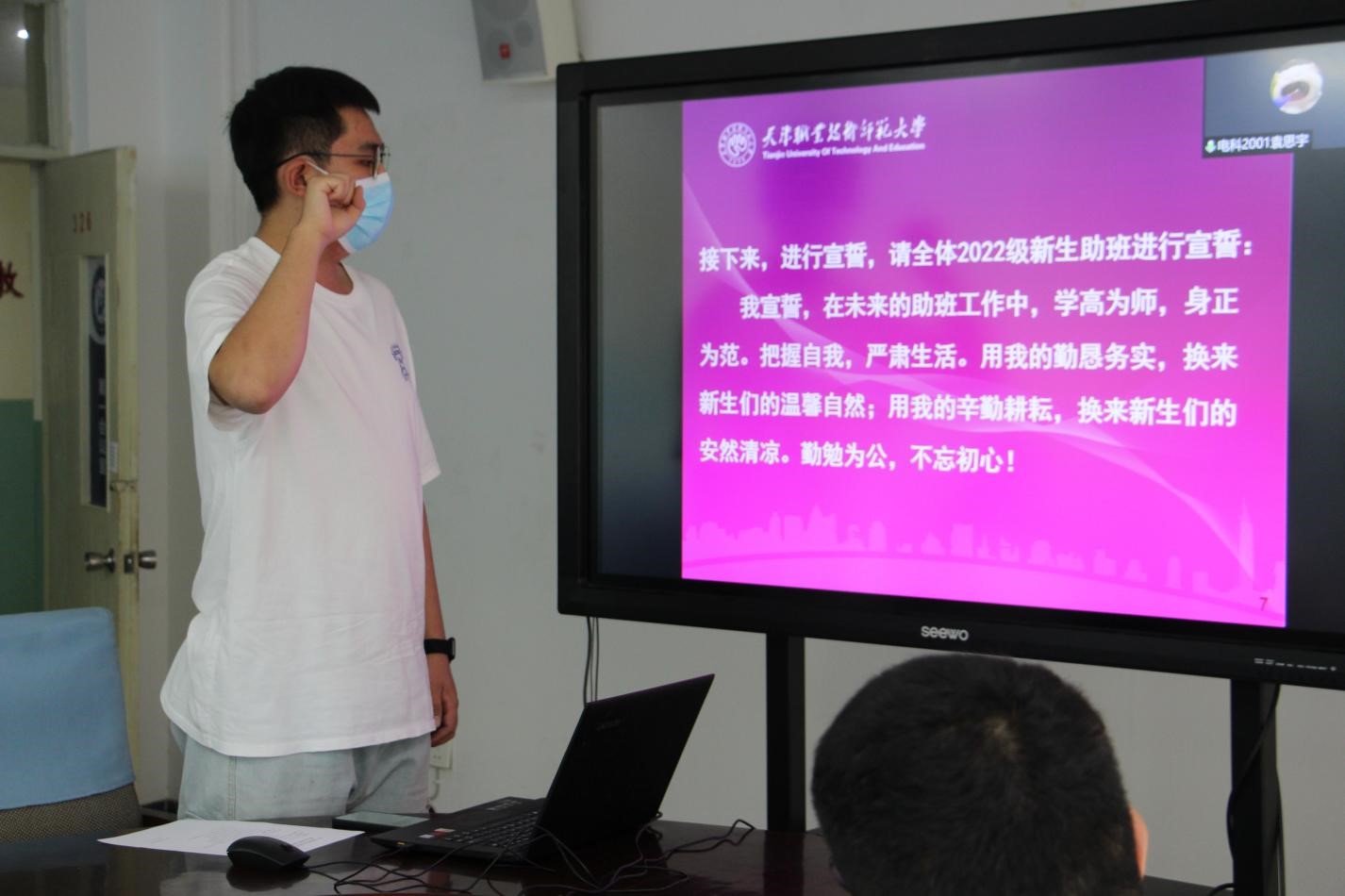 随后,2021级助理班主任代表蒋磊磊、赵怡然发言,介绍了一年来的助班工作经验和注意事项。2022级助理班主任代表孙浩凯发言,表示要按照学院新生工作要求,不断提升为新生服务的本领,全力做好2022年迎新及军训工作。全体2022级新生助理班主任进行宣誓。