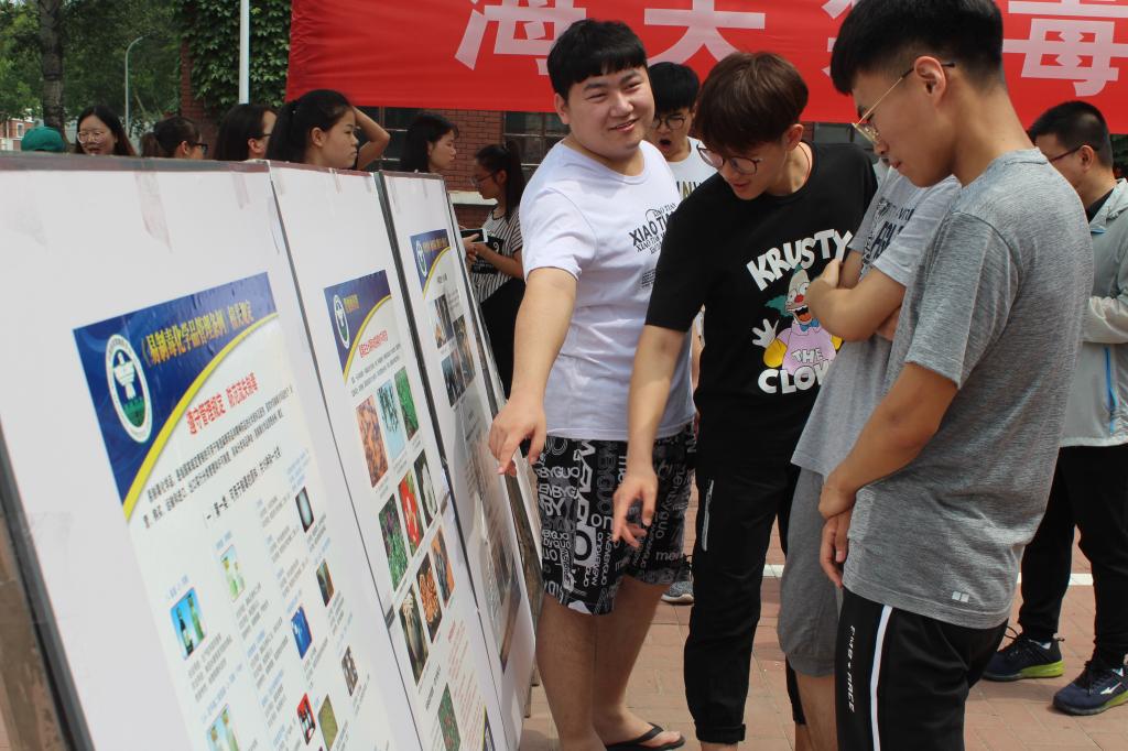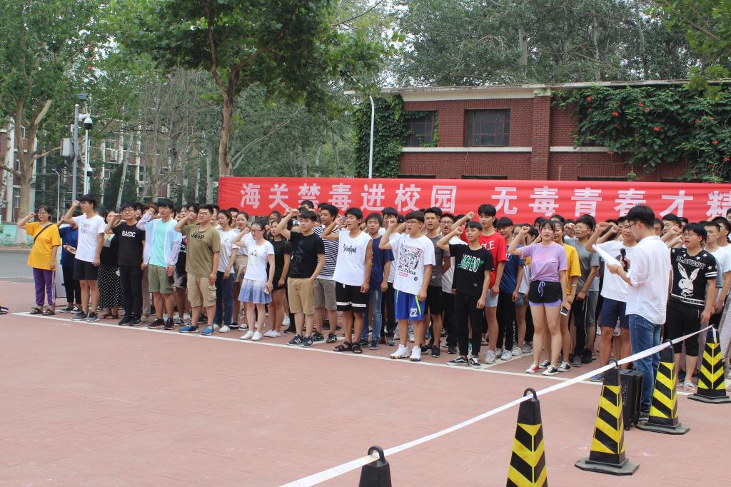 首先,天津机场海关缉私分局警官介绍了“国际禁毒日”的由来以及相应的国际禁毒形势,并指引同学们一起参观学习了禁毒宣传展板的相关内容,同学们学会了辨识毒品和毒品的危害,随后师生一齐宣誓,表达出不贩毒、不吸毒、不制毒、不种毒的决心。