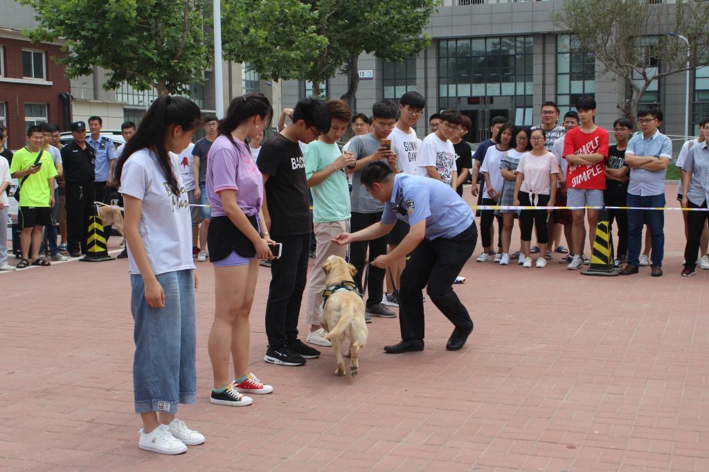 随后李伦警官为大家介绍了缉毒犬的训练反执勤情况,并且现场牵出两只“缉毒功臣”的缉毒犬鲍威尔和欧利维亚。现场警官邀请同学们开展模拟缉毒活动,首先志愿者同学将有毒品气味的毛巾随机放入行李箱中和汽车底盘处,警官带领着缉毒犬对现场放置的数个箱包和车辆进行缉毒检查,缉毒犬迅速找到了藏有嗅源的毛巾,赢得了现场师生的热烈掌声。随后,现场选取7名志愿者同学,随机在一名同学身上藏有毒品气味的毛巾,缉毒犬通过嗅识迅速找到藏匿的嗅源。活动最后,同学们纷纷上前抚摸缉毒犬、询问缉毒犬状况,并与缉毒犬合影留念。