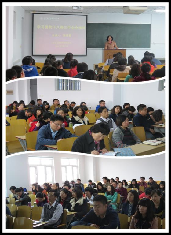 在机电楼605召开理论学习会。社科部副主任张葆春应邀作了党的十八届三中全会精神辅导报告。学院全体党员教师和学生党员一同聆听了报告。报告会由学院党总支书记李长爱老师主持。