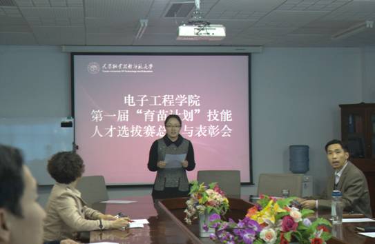 第一届“育苗计划”技能创新人才选拔赛总结表彰会在机电楼326举行。教学副院长刘芬、科研副院长李士心、实验实训中心主任杨旭、电子信息工程系主任姜德宁、微电子系主任王爽、应用电子技术教育系主任方强等参加并为获奖学生颁奖。会议由副院长助理李雅静主持。