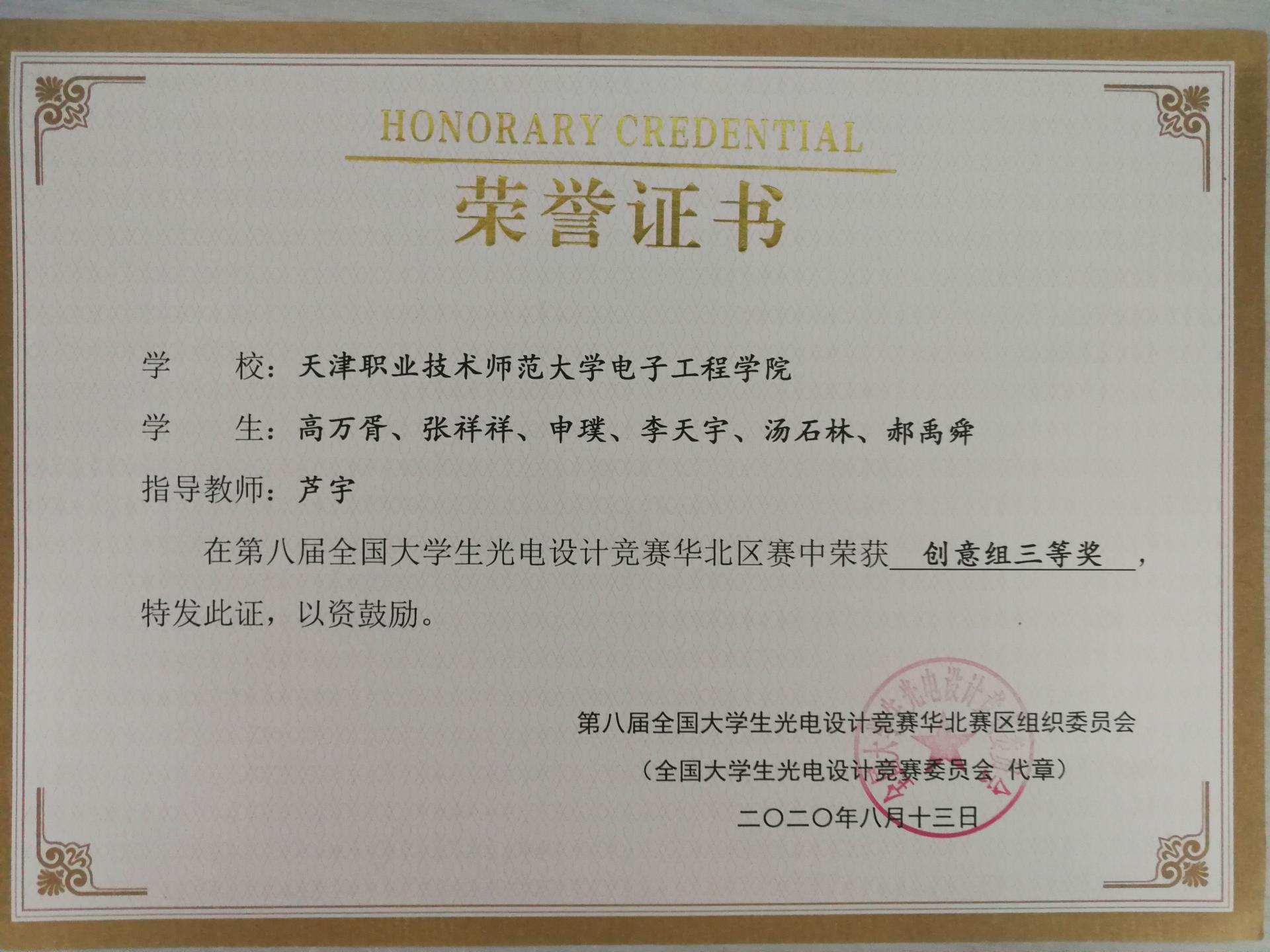 2020年8月13日,第八届全国大学生光电设计竞赛华北赛区决赛在燕山大学举办,竞赛通过腾讯会议线上答辩的形式举行。学院芦宇老师指导、高万胥担任队长,张祥祥、申璞、李天宇、汤石林、郝禹舜共同参加的《基于智能手机的苹果糖度无损测量》赛题,在一众参赛队伍中脱颖而出,荣获三等奖。