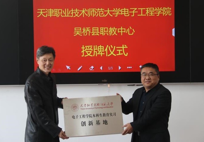 本科生教育实习创新基地”授牌仪式在吴桥职教中心隆重举行。我院党委书记程中、电子科学与技术系系主任倪晓昌、教授刘盾、教师代表曲芳以及6名光电信息科学与工程专业实习生,吴桥县教体局党委副书记徐达飞,吴桥县职教中心常务副校长张宏路、副校长魏丽丽、陈斌等出席了本次仪式。