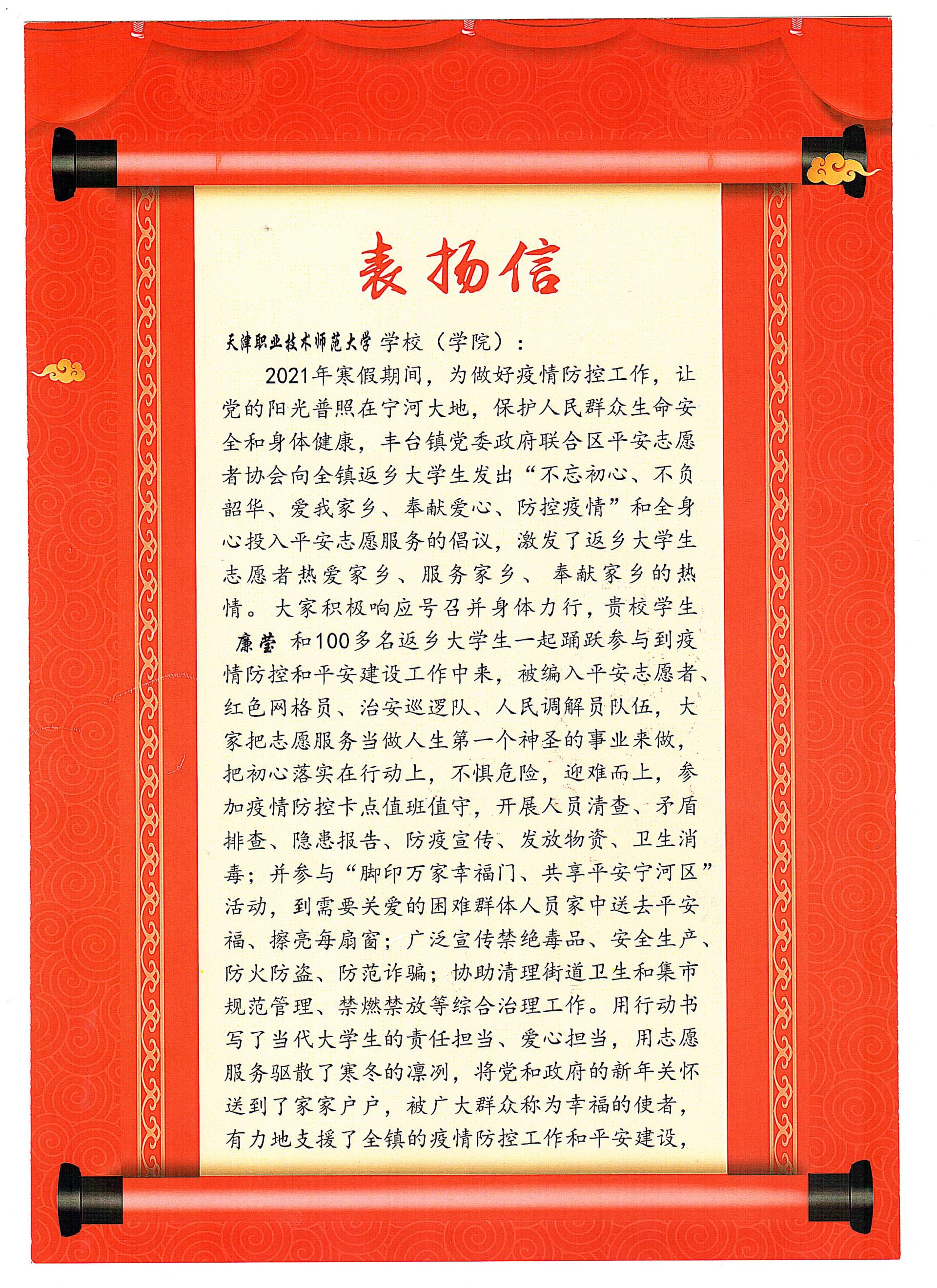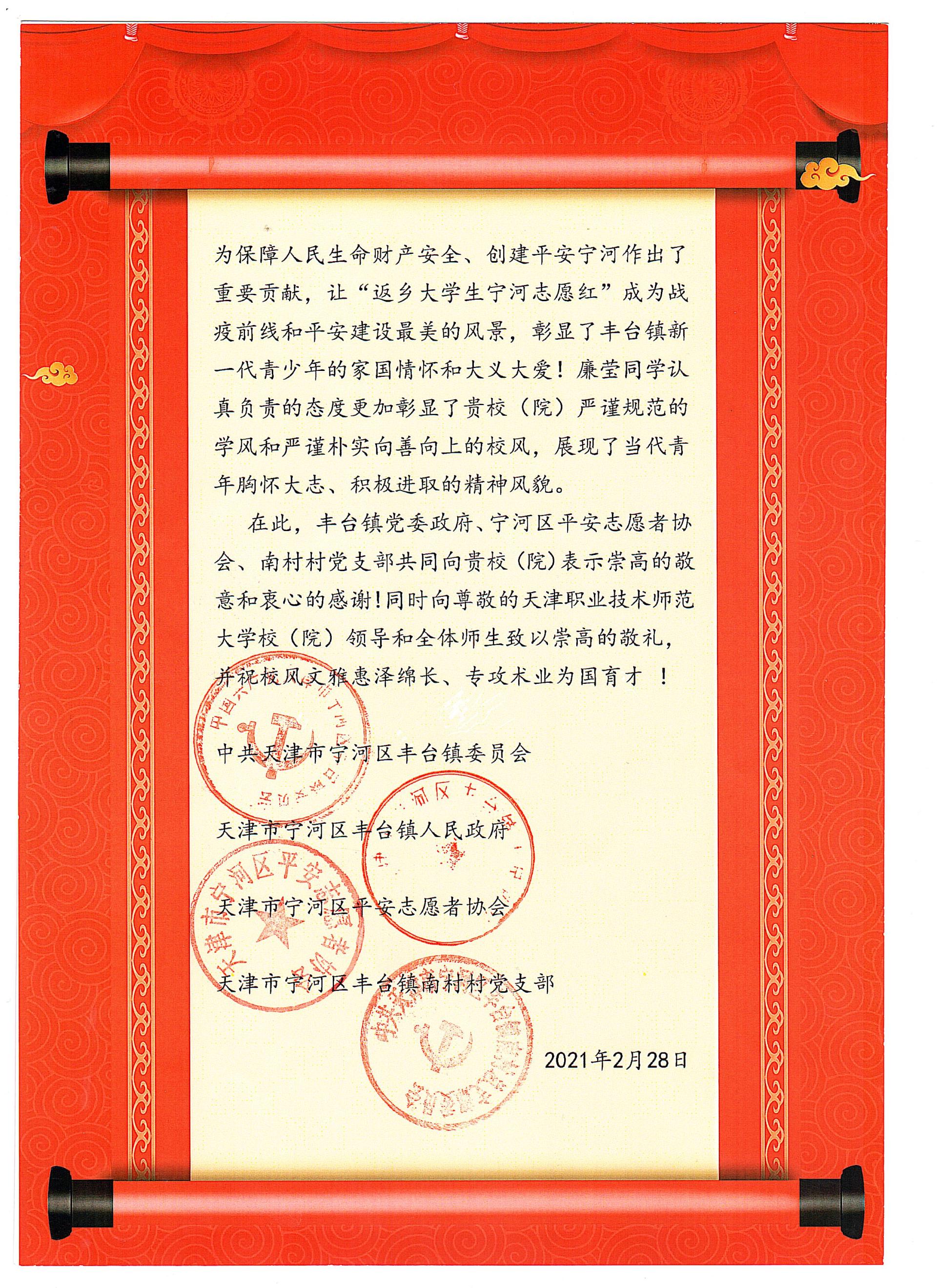 的学生积极响应学院号召,纷纷投入到家乡的疫情防控和经济建设志愿服务中。其中,光电信息科学与工程专业18级廉莹,于1月15日至2月5日在自己的家乡天津市宁河区丰台镇,积极投身到疫情防控和平安建设志愿服务中,用实际行动践行新时代青年的责任与担当,得到了一致好评。丰台镇党委政府、宁河区平安志愿者协会、南村村党支部对廉莹同学的志愿服务工作给予了好评,同时也对腐漫画