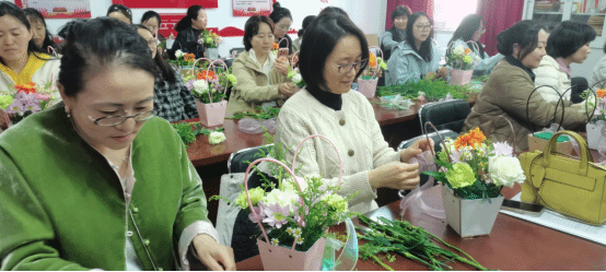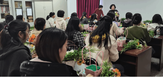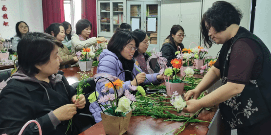 本次活动特邀资深花艺师现场教学,从花材特性、色彩搭配到造型技巧,通过“讲解+示范+实操”模式,引导老师们亲手创作。在专业花艺师的悉心指导下,老师们手持花枝,精心修剪,巧妙搭配,将玫瑰的热烈、康乃馨的温情与非洲菊的清新错落有致地组合在一起。大家时而专注创作,时而低声交流心得,现场花香四溢,笑语盈盈。最终,一件件独具匠心、清新雅致的花艺作品在一双双巧手中诞生,寄托着全体女教职工对生活的热爱和对美的追求。